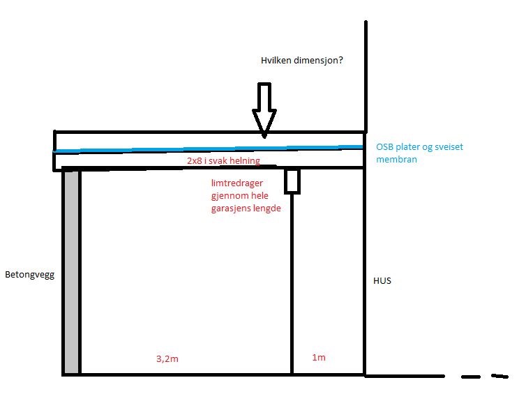 Skal bygge en garasje inntil huset og vil ha terrasse på toppen. Lurer på hvilken dimensjon man bør bruke på bjelkene som blir lagt oppå membranen. Siden taket har svak helning må jeg vel skråskjære bjelkene slik at terrassen blir rett. Er det nok å bruke f.eks 48x98? Se figur for detaljer.