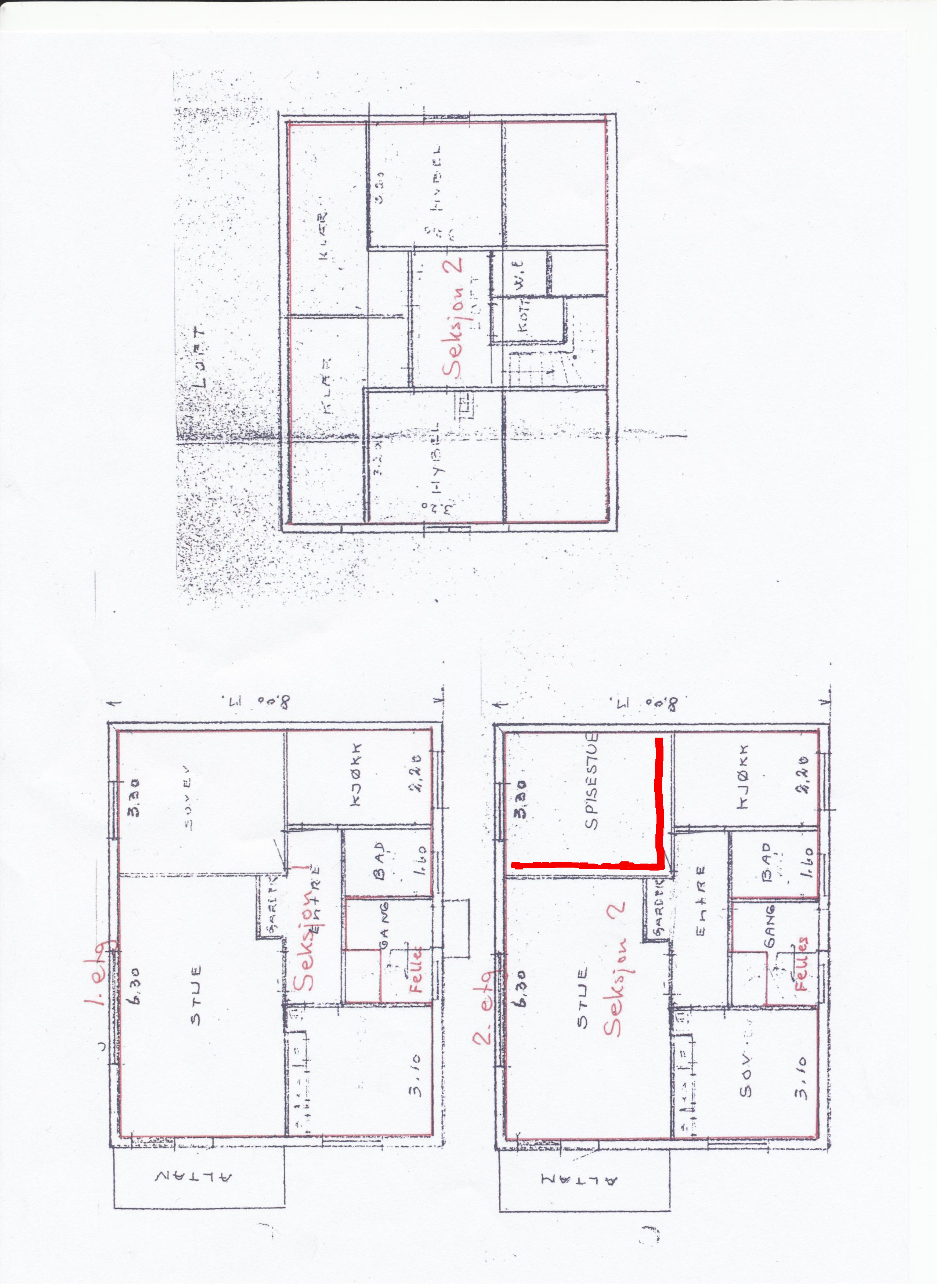 Det var det at de sto tett i tett og dannet en vegg som gjorde at jeg syntes dette så merkelig ut. På den ene veggen hadde jeg tenkt å sette inn en dør, men kan vel også lekte ut slik at elektrikeren får plass til skjult anlegg også på de 2x4 veggene også, om de må bli stående. Legger ved de plantegningene jeg har av huset, har tegnet inn de to veggene jeg har tatt bilde av med en rød strek her. Fra plantegningen ser det ut som om det faktisk har blitt flyttet litt på den ene veggen jeg tok bilde av (den med en vanlig 70 dør), samt at "Spisestue" har fått installert en dobbel skyvedør som heller ikke er på tegningen etter hva jeg ser..