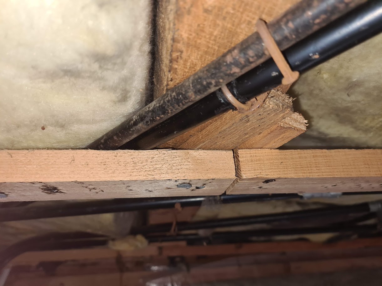 Under bjelkelaget er det lagt avstandsklosser etterfulgt av lekter. Avstandsklossene for å få plass til stålrør. Legger med ett bilde så blir det enklere.
