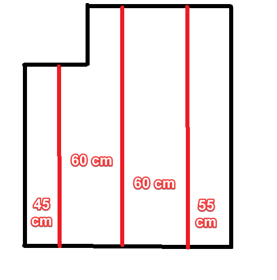 Sort er vegger, rød er bjelkelag. ca 210 i bredde og 320 i lengde på rommet.