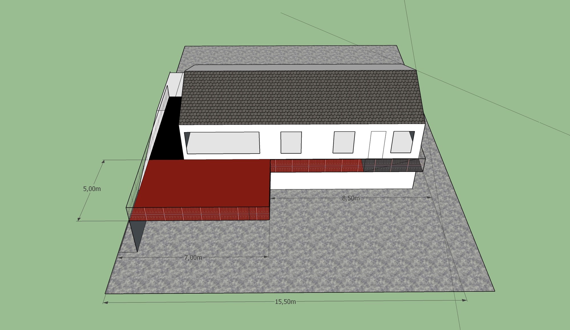 Grunntanken med 5 meter veranda var å kunne parkere bilen under om vinteren. Men jeg skal klare meg med 3 meters bredde også om jeg klarer å bygge verandaen med den bredden uten å måtte støtte oppunder på midten.
