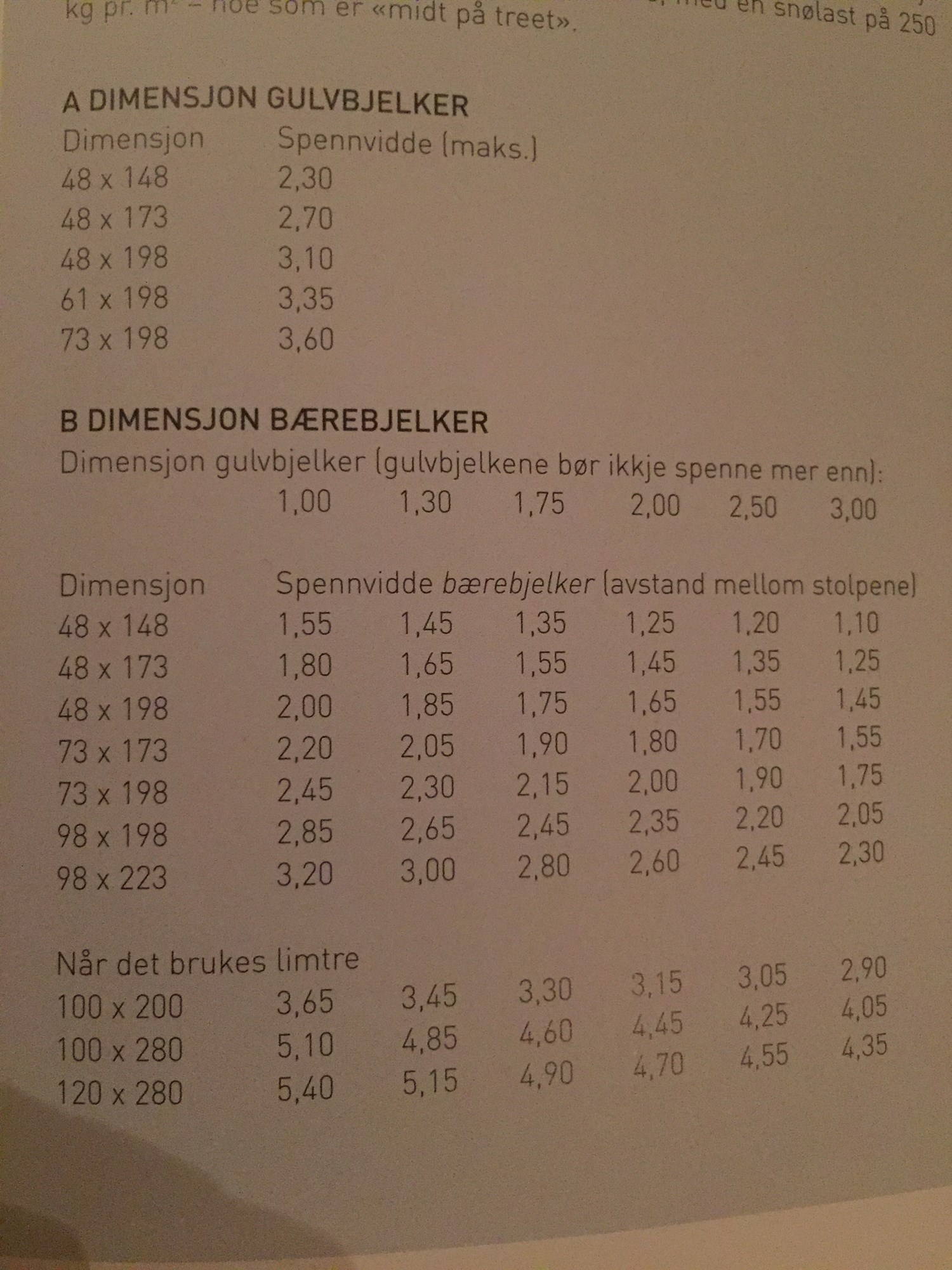 Den øverste sier vel at en gulvbjelke (48x148) ikke bør strekkes lengre en 2,3 meter.Det 2 nederste er vel bæring av "limtre" (avstand mellom stolper) Ville overdimensjonert selve bæringen. "strekker" du deg helt til yttergrense på tabell. Så risikerer du ned bøying om vinteren. Da må du kanskje ut å måke snø når det blir over 15cm snø og du kan få vibrasjoner når går går på terrassen. Ville overdimensjonert ett hakk på tabellen.La selv gulvbjelker (48x148) på c/c 40 for å øke stivhet. Og 3 meter mellom stolper. Under limtre.