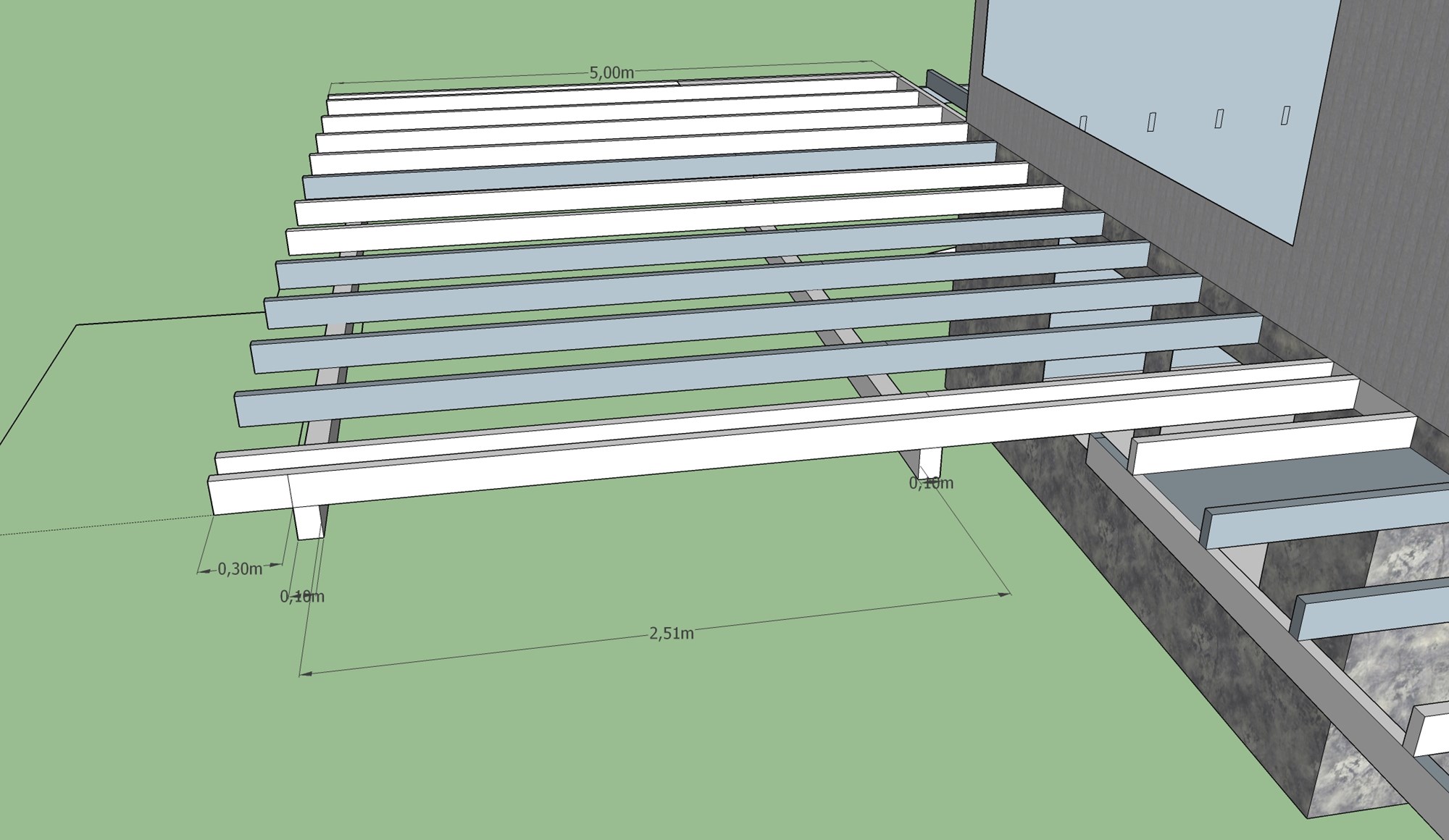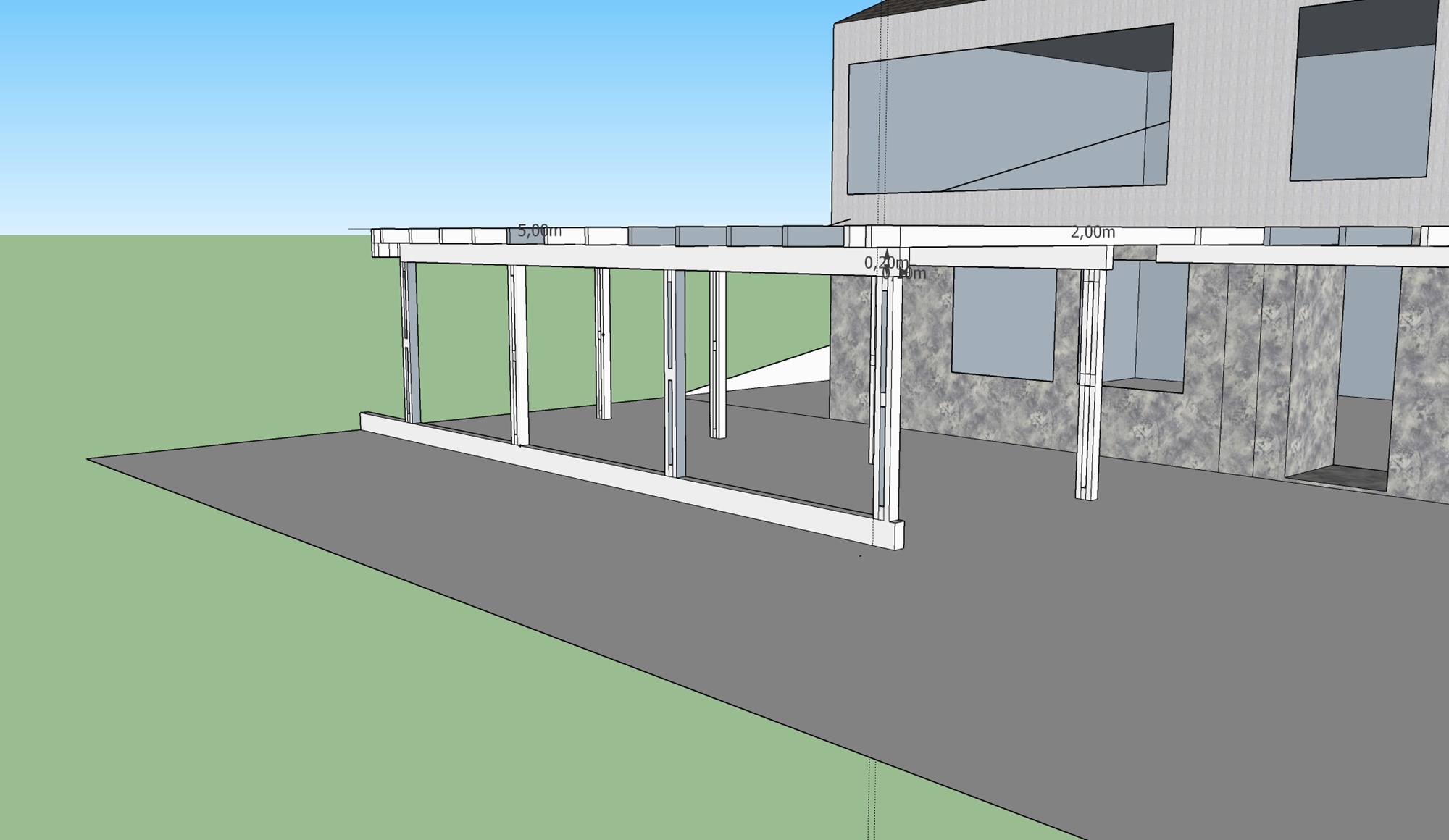 2,5 meter ifra husveggen setter jeg opp søyler og en bære bjelke på 98*223, så fortsette det ut til enden på balkongen med nye søyler og bærebjelke på 98*223 Da blir jo aldri spennet over 2.5 meter, og jeg kan parkere bil under balkongen.