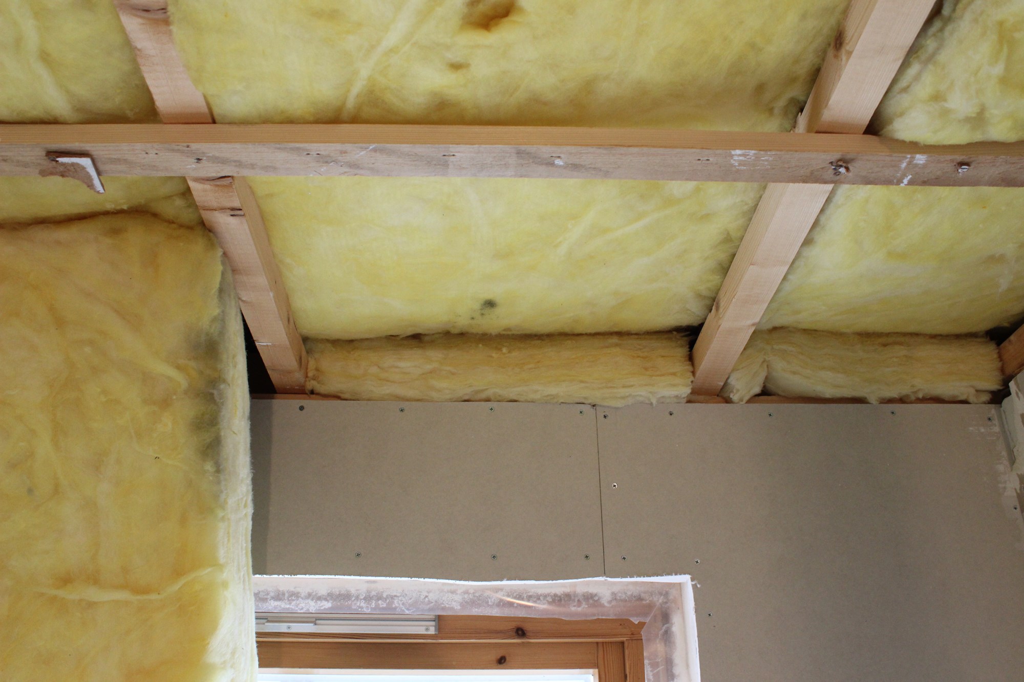 I etasjeskillet mellom 1 og 2 etasje (varme rom) er det brukt glava på rull som mot ytterveggen blir "kilt" opp ved hjelp av ett ytterligere lag med isolasjon som er lagt under (se bildet)