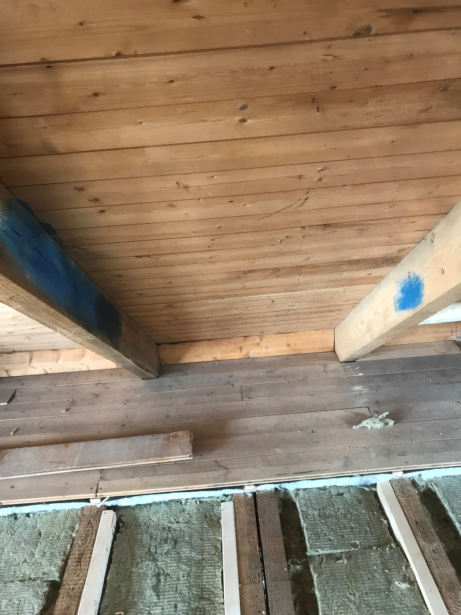 Bildet dere ser er i en 2.etg og der panelen stopper på gulvet skal det settes opp en ny knevegg. Tidligere var kneveggen lenger ute i rommet (rommet ble brukt som soverom). For å spare plass tenker jeg nå å isolere mellom bjelkene i stedet for utenpå panelet som i dag ligger utenpå bjelkene. Det skal fortsatt være soverom og spørsmålet er stilt for å finne ut hvordan jeg kan få et godt inneklima samtidig som jeg beholder god lufting (som i gamledager).