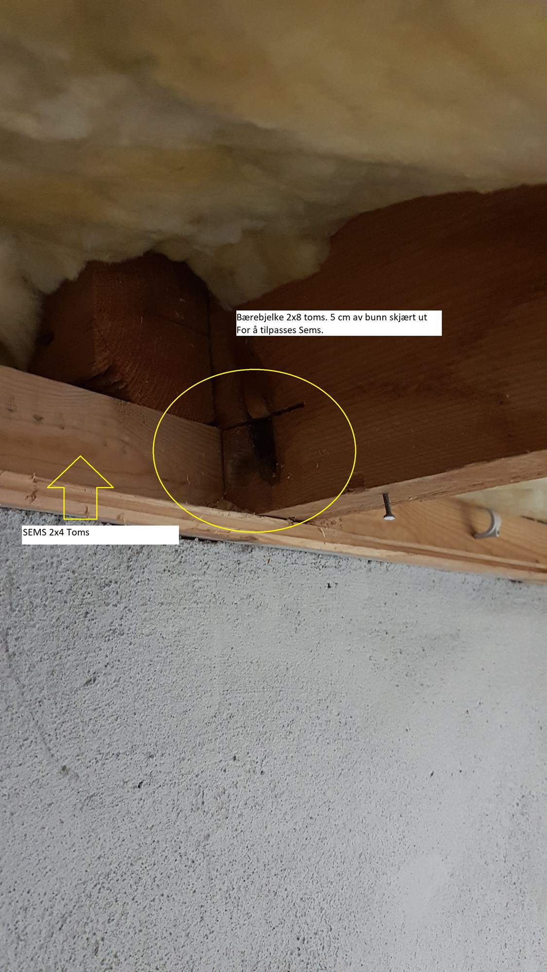 Jeg tenker at de nye 2x8 toms som jeg skal legge inntil som en forsterkning i samvirke med de gamle, vil jeg ha hele bjelken nedpå, og vil derfor kutte vekk bit av sems der hvor ny tilleggsbjeke legges innpå.