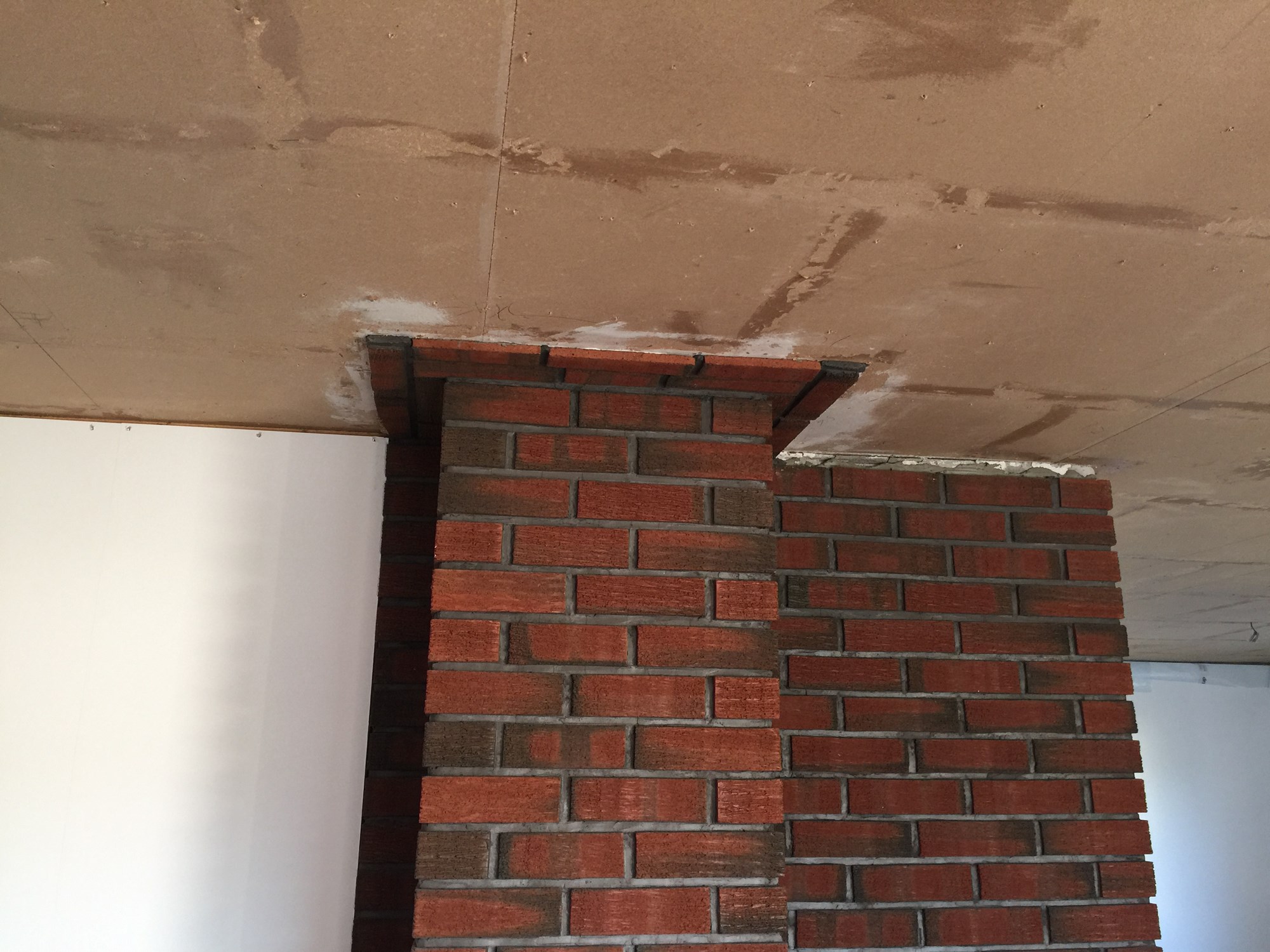 Tenkte kanskje å legge en glattkantlist på høykant mot murstein slik at denne flukter med gips og dermed sparkle/pusse skjøt. Men usikker på om dette blir noe fint. Alternativt vurderer jeg å slå bort mursteinen i himlingen, men litt usikker på om den har en brannhemmende funksjon.