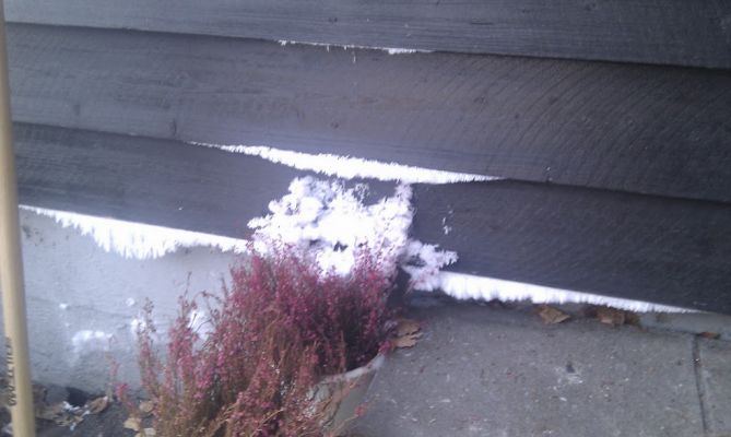 Det er jo bikkjekaldt for tiden, og har den siste tiden lagt merke til at det på et sted på ytteveggen (nordvegg) hoper seg opp med rim...Se bilde.