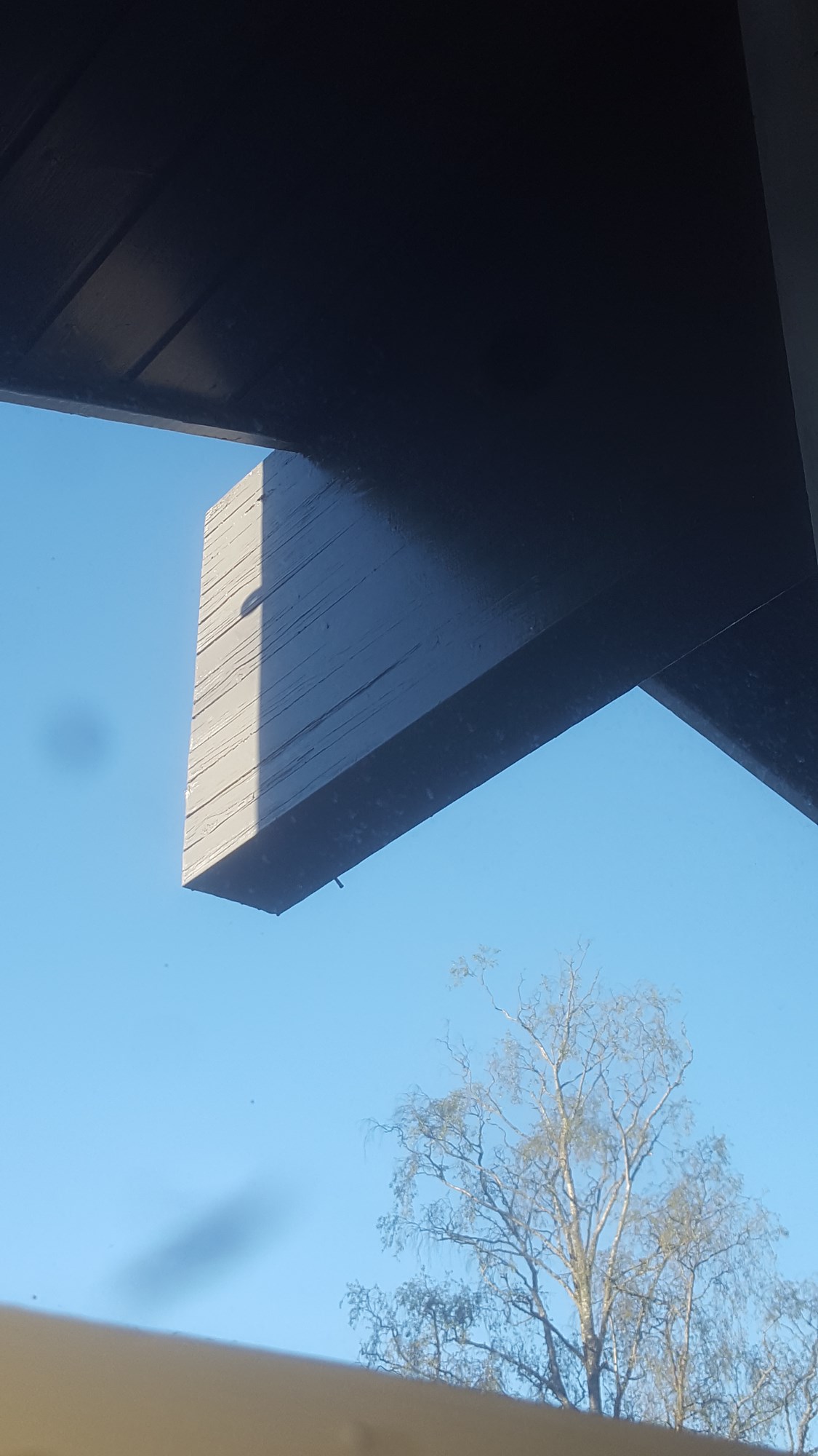 På hytta er det foreløpig en bit med takpapp på enden av limtredrageren, litt våt har den også blitt hos meg.