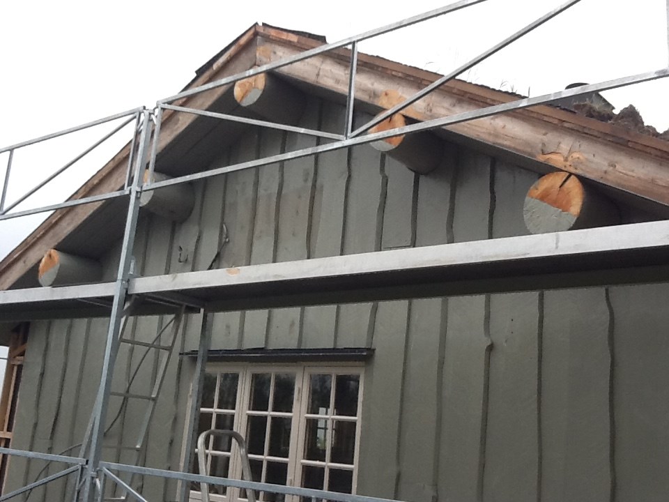 Planen er å skjøte ut rundstykkene til foran verandaen. Ca 3.5 meter. Oppå der skal det monteres sperrer, tro,papp,knottplast og torv slik som på hovedhytta. Jeg har alle materialer skåret ferdig med nye rundstokker og hele sulamitten. Jeg har en plan i hodet på hele greia. Men jeg greier ikke å bestemme meg helt på hvordan rundstykkene skal skjøtes for å lage minst mulig inngrep i hytta. Har flere alternativer på utførelse men greier ikke bestemme meg.
